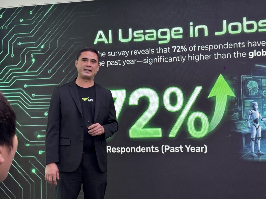 จากการเปิดเผยข้อมูลวิจัยโดย PWC พบว่าในปีที่ผ่านมา คนไทยมีการใช้งาน AI ในการทำงานสูงถึง 72% ซึ่งมากกว่าค่าเฉลี่ยทั่วโลกที่อยู่ที่ 54% นอกจากนี้ ผลสำรวจยังชี้ว่า 90% ของผู้ใช้รู้สึกว่ามีผลิตภาพ (Productivity) ดีขึ้น และกว่าครึ่งรู้สึกมั่นคงในหน้าที่การงานมากขึ้นเมื่อใช้งาน AI เป็น AIS จึงนำข้อมูลเหล่านี้มาเป็นแรงผลักดันในการสร้างระบบนิเวศ AI เพื่อคนไทย