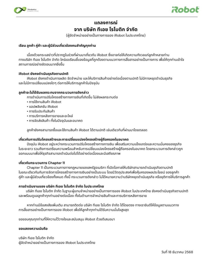 บริษัท ทีเอช โรโบติก จำกัด ผู้จัดจำหน่ายอย่างเป็นทางการของ iRobot ในประเทศไทย ได้ออกแถลงการณ์ชี้แจงเพื่อสร้างความมั่นใจให้กับลูกค้าและคู่ค้า หลังมีกระแสข่าวเกี่ยวกับการดำเนินงานของ iRobot ในระดับโลก โดยยืนยันว่าการปรับโครงสร้างการเงินที่เกิดขึ้นจะไม่ส่งผลกระทบต่อการให้บริการและการดำเนินธุรกิจในประเทศไทยแต่อย่างใด