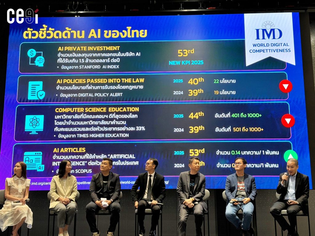 ข่าวดีคือประเทศไทยมีความตื่นตัวเรื่องนโยบาย เรามีแผนปฏิบัติการ AI แห่งชาติมาตั้งแต่ปี 2565 และการนำ AI ไปใช้ในภาครัฐก็ถือเป็นจุดแข็ง แต่ข่าวร้ายที่ไม่อาจมองข้ามคือ ขีดความสามารถทางดิจิทัลของเราในเวทีโลกกำลังถดถอย ดัชนี IMD World Digital Competitiveness ของไทยร่วงลงอย่างต่อเนื่อง