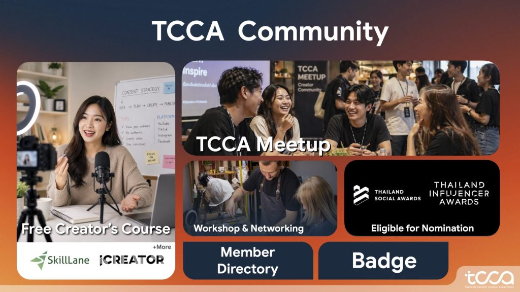 ผู้ที่สนใจร่วมเป็นส่วนหนึ่งในการผลักดันอุตสาหกรรม ไม่ว่าจะเป็นครีเอเตอร์ เอเจนซี หรือแพลตฟอร์ม สามารถติดตามข้อมูลข่าวสารและสมัครสมาชิกได้ทาง Facebook: สมาคมคอนเทนต์ครีเอเตอร์ไทย – TCCA หรือ LINE OA: @tcca