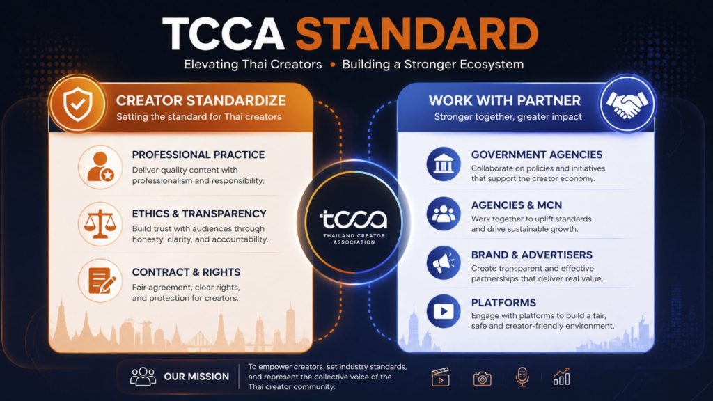เพื่ออุดช่องโหว่และยกระดับอุตสาหกรรม สมาคมฯ ได้ประกาศเตรียมใช้เวลา 4 เดือนในการร่างมาตรฐานกลางที่เรียกว่า TCCA Standard ซึ่งจะครอบคลุมทั้งความเป็นมืออาชีพ การทำสัญญา และแนวปฏิบัติด้านจริยธรรม มาตรฐานนี้จะถูกนำไปใช้อย่างเป็นรูปธรรม โดยร่วมมือกับเวทีประกาศรางวัลใหญ่ระดับประเทศ เช่น Thailand Social Award และ Thailand Influencer Award เพื่อใช้เป็นเกณฑ์คัดกรองผู้เข้าชิงรางวัล ซึ่งจะเป็นการส่งเสริมครีเอเตอร์ที่สร้างสรรค์และลดพื้นที่ของครีเอเตอร์สายเทา