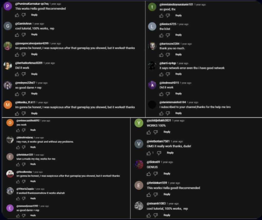 กลุ่มแฮ็กเกอร์เพิ่มความน่าเชื่อถือ ด้วยการ ใช้บัญชีปลอมและบัญชีที่แฮ็กมาใช้กดไลก์ คอมเมนต์เชิงบวก และโพสต์ชุมชน ทำให้เกิด “หลักฐานทางสังคม” ปลอม ๆ ที่หลอกให้ผู้ชมเชื่อว่าเนื้อหาน่าเชื่อถือ แม้ YouTube จะลบวิดีโอหรือช่องบางรายการออกไปแล้ว แต่ ด้วยการทำงานแบบเครือข่ายและมีการเปลี่ยนบัญชีอย่างรวดเร็วก็ทำให้กลลวงแบบนี้กลับมาทำงานต่อได้อีก