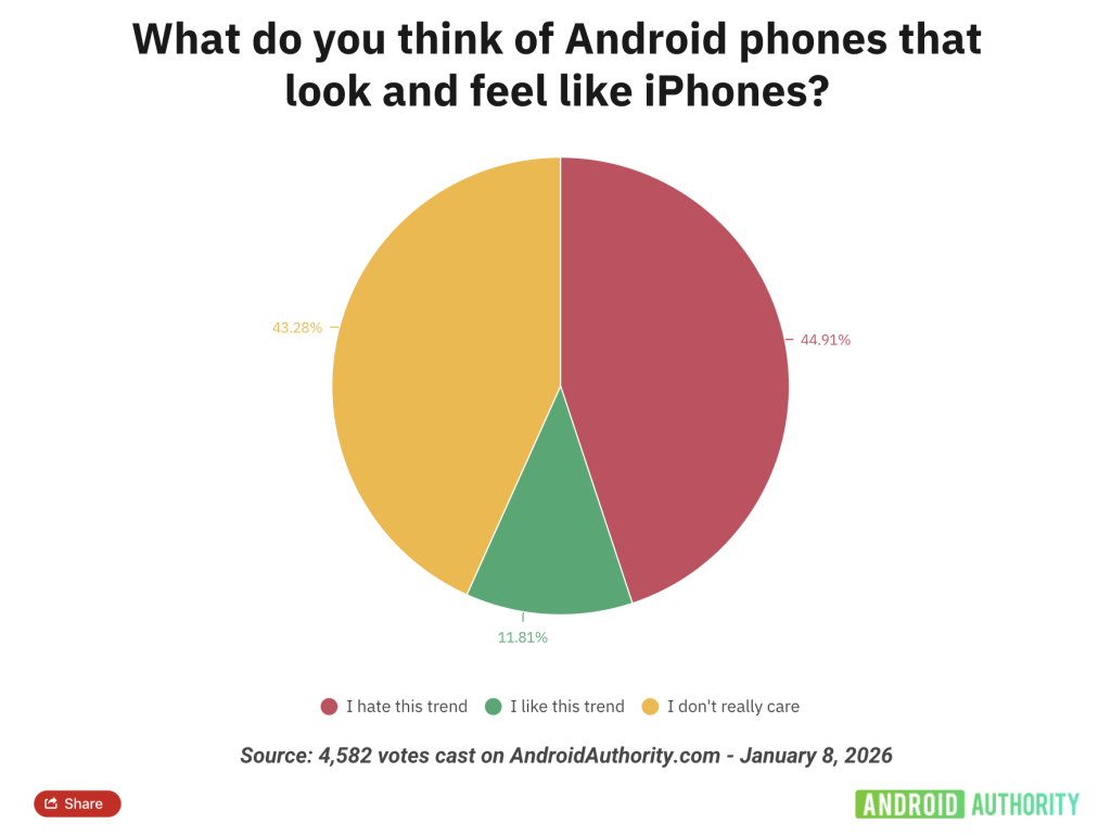 นอกจากเรื่องหน้าตาเครื่องหรือฮาร์ดแวร์ที่เริ่มดุเหมือน iPhone แล้ว ซอฟต์แวร์ก็ดูเหมือนจะเริ่มได้รับแรงบันดาลใจมากขึ้นเรื่อย ๆ ด้วย เว็บไซต์ Android Authority ได้ทำโพลสอบถามแฟน ๆ Android ว่าชอบที่ผู้ผลิตสมาร์ตโฟนแบรนด์ต่าง ๆ ทำแบบนี้ออกมาหรือไม่ ผลที่ได้คือ