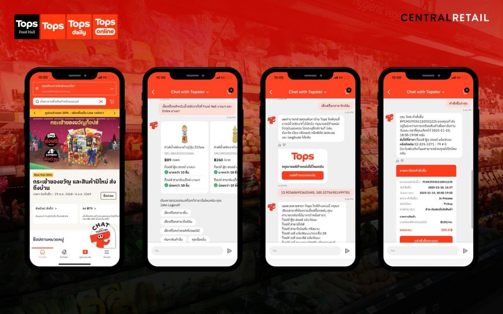 ท็อปส์ เจ้าของธุรกิจฟู้ด รีเทล ในเครือเซ็นทรัล รีเทล จับมือ Google Cloud เปิดตัว Next-Generation AI Chatbot แชทบอทอัจฉริยะรุ่นล่าสุดที่ขับเคลื่อนด้วยเทคโนโลยี Google Cloud’s Conversational Agents (เดิมคือ Dialogflow CX) โดยไฮไลต์เด็ดอยู่ที่ฟีเจอร์ เช็กสต็อกสินค้าภายในสาขาแบบเรียลไทม์เป็นครั้งแรก ช่วยให้ลูกค้าตรวจสอบความพร้อมของสินค้า ณ สาขาใกล้บ้านได้ทันทีผ่านแชทก่อนออกเดินทาง พร้อมให้บริการตลอด 24 ชั่วโมง เพื่อยกระดับประสบการณ์ช้อปปิ้งแบบออมนิชาแนลให้ไร้รอยต่อยิ่งขึ้น