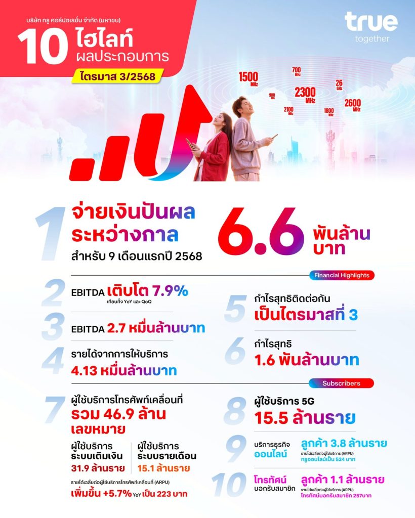 สำหรับไตรมาส 3/2568 ทรูฯ มีกำไรสุทธิ 1,600 ล้านบาท โดยมี EBITDA อยู่ที่ 27,000 ล้านบาท เพิ่มขึ้น 7.9% จากช่วงเดียวกันของปีก่อน